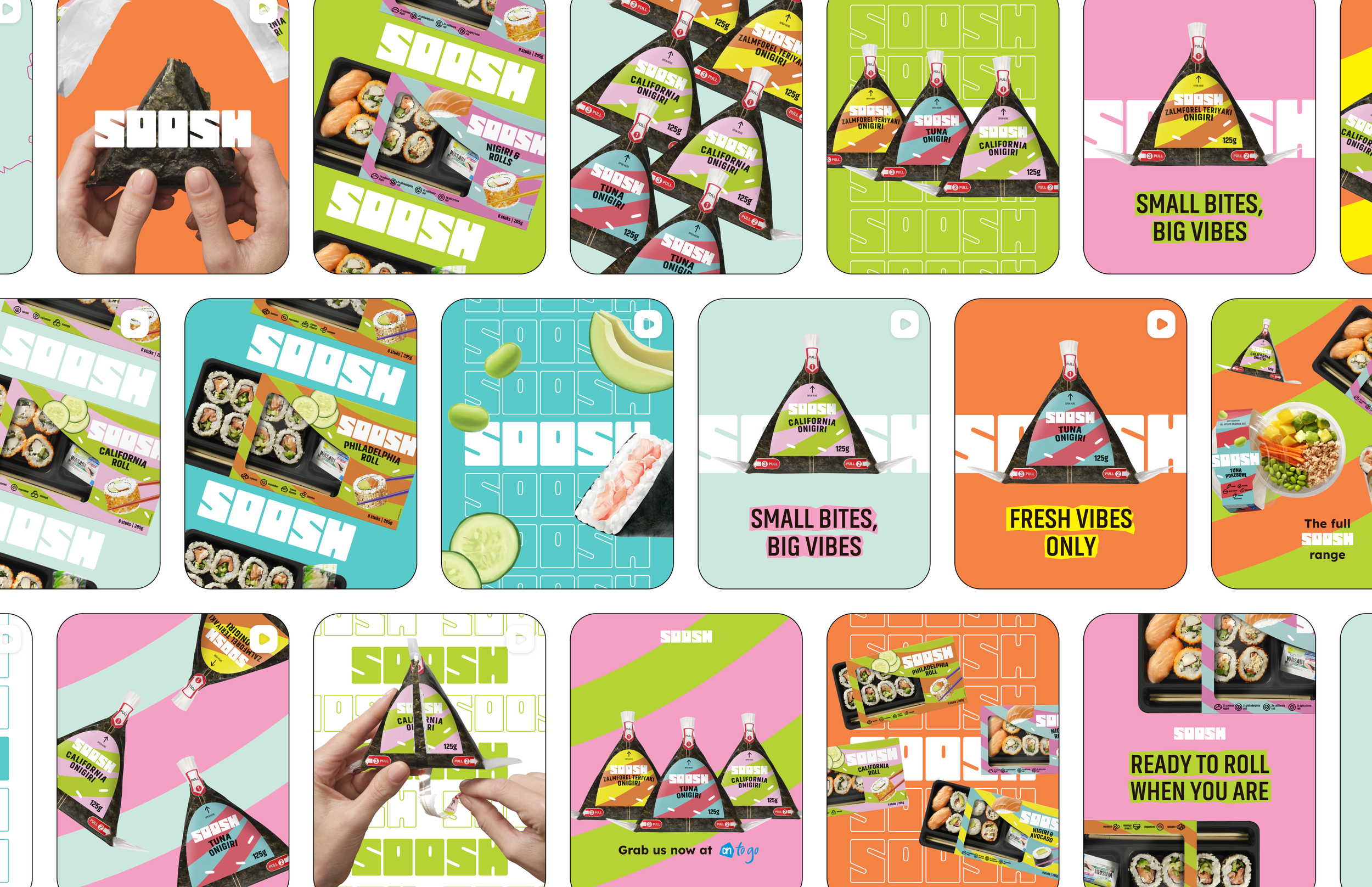 For a bold, fast-moving sushi and onigiri brand, SOOSH needed a social-first visual system — designed to live in the feed as much as on the shelf.